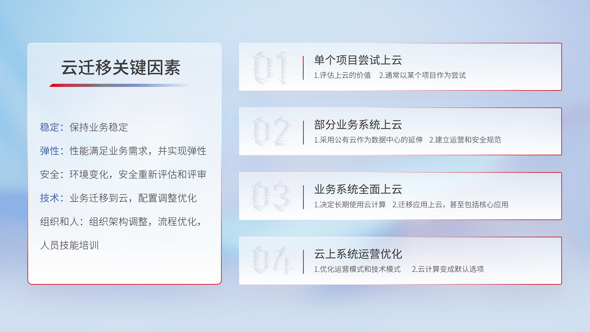 结合实际业务,,从规划设计、、、云平台选型、、云原生改造、、数据迁移、、、、集成交付,,,,迁移全过程为客户识别最佳上云路径,,做好风险识别管理,,设计网络架构、、、、身份权限、、、、安全审计合规、、、操作审计、、、日志审计、、、、监控告警策略、、、、多站点容灾设计等,,对云上基础设施进行整体规划,,,提升IT治理水平,,,以满足弹性、、高可用、、、高性能的需求。。。。