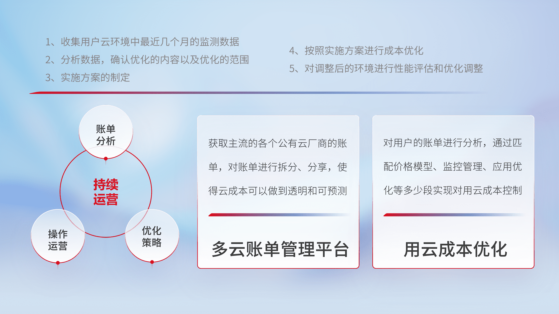 通过多云纳管,,,,以统一的资源数据模型把客户的云资源进行抽象和封装,,,,进而实现对多云资源的统一操作,,,,保障云资源管理的可靠性、、、、稳定性与可用性。。。量身定制化运维内容,,配置、、、开发运维、、、补丁管理、、、、备份、、监控、、认证和访问管理、、审计和日常巡检等,,,保障在用云过程中的可靠度,,稳定度以及高可用率。。。